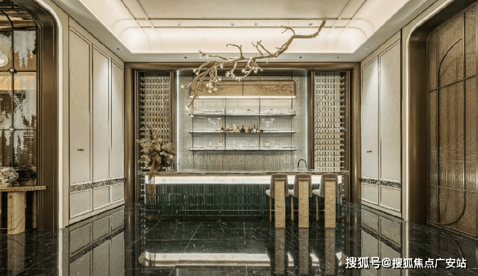 空间设计中奢石含量极高,从入户处的玲珑玉拼花与透光云石辉映,到翡翠绿奢石墙景、再到发光云石装饰点亮归家路,石材的典雅贯穿始终。约6.4米奢尺挑高客厅,以宏大格局容纳天光云影成为从容待客、优雅生活的社交主场。东方美学不着痕迹融入当代墅居,在一器一物、一景一画中流露东方气韵。