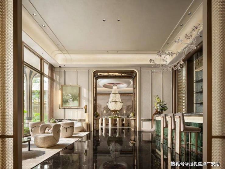 在景观落地窗环绕中,私宴厅以“花廊序列,美学对景”构筑专属的私谧空间,巨型水晶吊灯与浅色饰面的搭配,色彩质感上相得益彰,营造融合艺术、文化与生活美学的奢享感场域,成就令人神往的优雅社交范式。