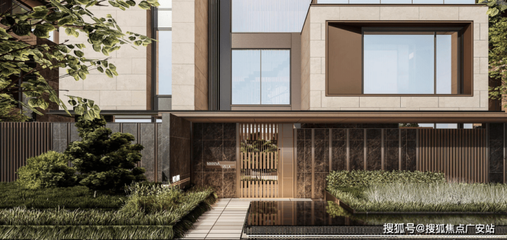 经典三段式别墅立面及大窗墙比,实现居住与自然的延伸;中灰色石材为基座,奢石宁静与土地矜贵互为映衬。