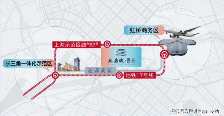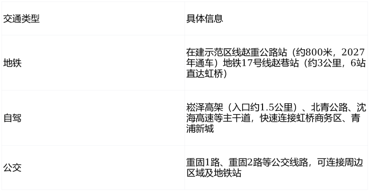 🚇双轨交+高架立体交通:距在建示范区线赵重公路站约800米(2027年通车),3站直达虹桥枢纽;距17号线赵巷站约3公里,6站直达虹桥;紧邻崧泽高架入口约1.5公里,3分钟可直达虹桥商务区,自驾便捷。