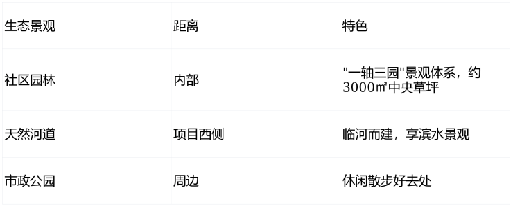 🌳生态居住环境:临河而建,社区内打造"一心三轴三组团"景观,楼间距宽达35米以上,充分保障采光与视野。