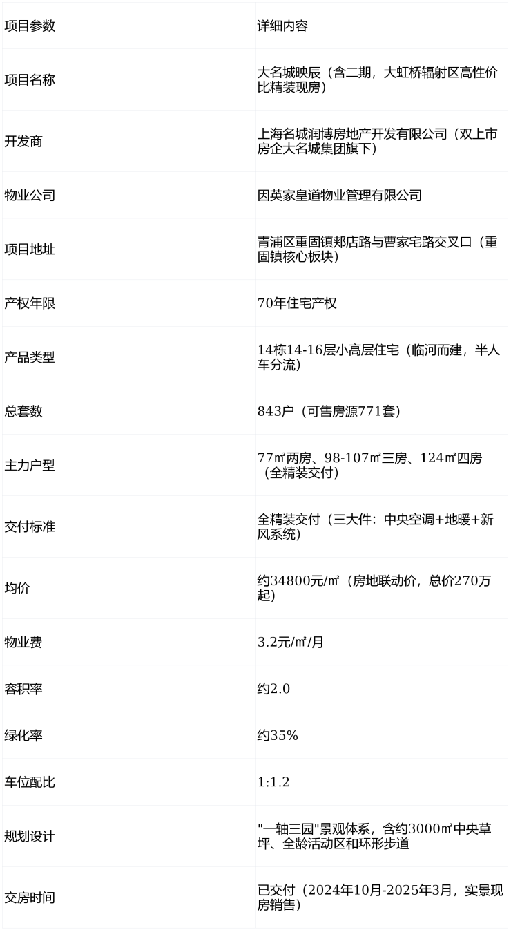 大名城映辰非常适合虹桥商务区、青浦新城两大核心板块的刚需和刚改型购房者,尤其是注重现房保障、高性价比和轨交便利性的年轻家庭。如果您能接受地铁2027年通车和区域配套逐步成熟的现状,这将是大虹桥板块极具竞争力的置业选择,可坐享长三角一体化和大虹桥发展的双重红利,以约3.48万/㎡的均价实现"300万级上车大虹桥精装三房"的梦想。