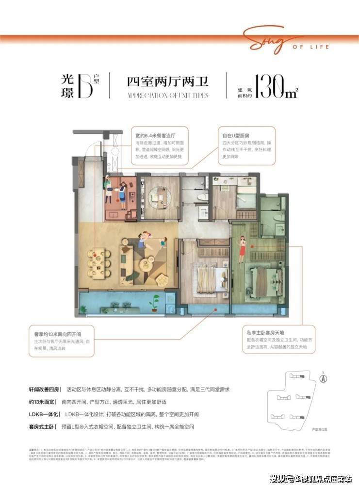 约106㎡户型点评:双联阳台约6.7米面宽,加设L型俯景面,满足晾晒、赏景、采光三重需求,LDKB一体化设计,打破各功能区域的隔离,整个空间更加开阔,开放式厨房 U型厨房,封闭敞开随心切换,高效台面设计,操作动线更加合理!