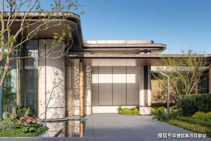 立面方面,汲取现代轻奢法式的白金美学灵感,叠加大面玻璃,打造出光影灵动的对称式金色画框立面。