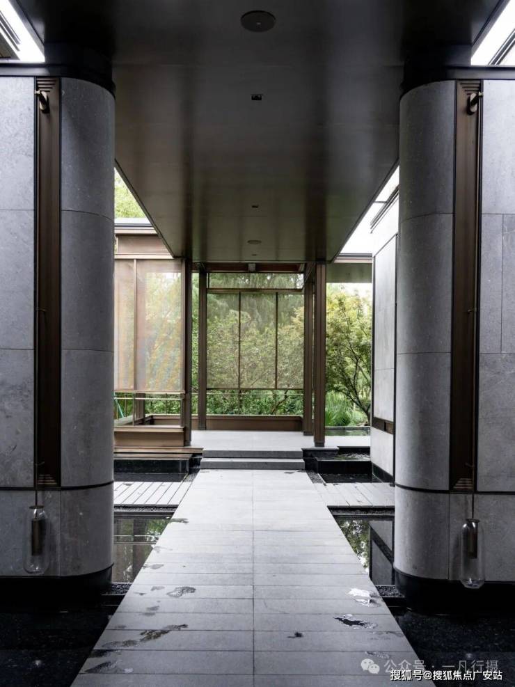 入口门廊古松相迎,倒影水中,含蓄的格栅与天井透露出隐奢意境。阳光从镂空门廊洒下,光影游走,让归家体验,从喧器到宁静实现自然过渡。