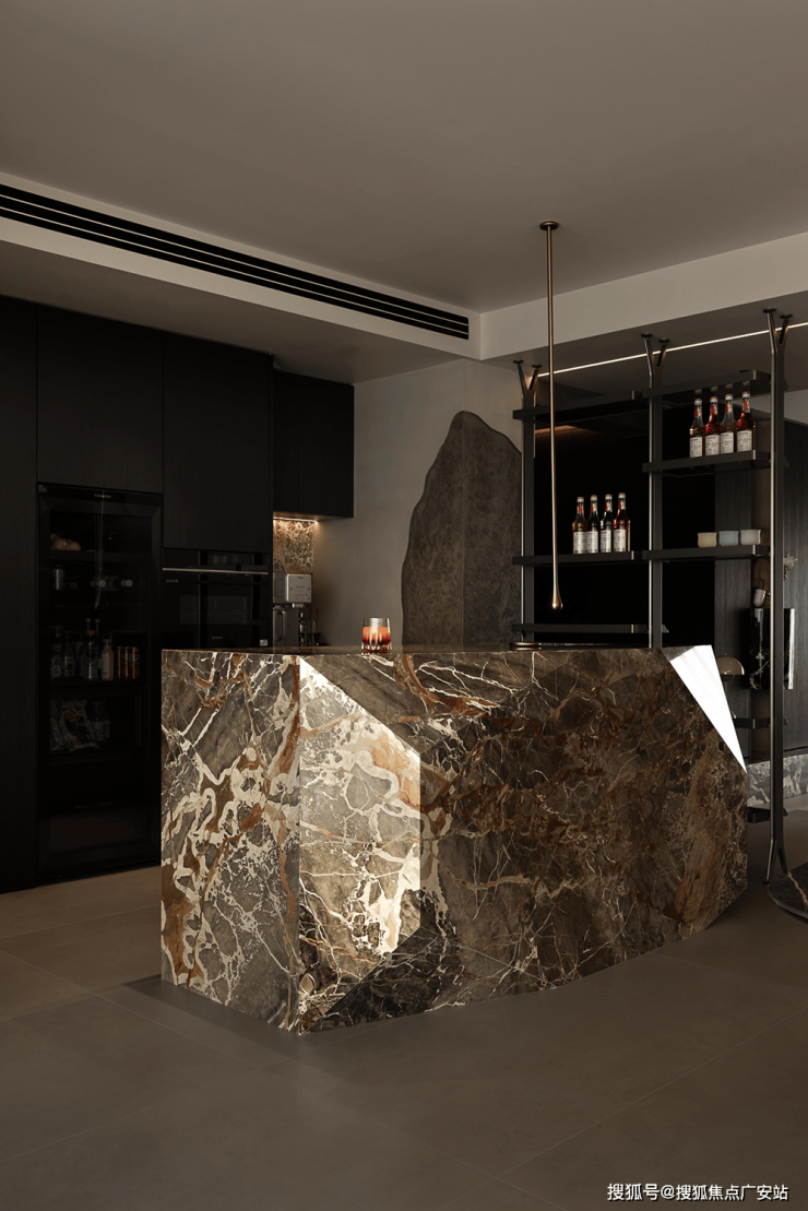 大理石岛台纹理纵横,棕褐与米白交织,仿若大地的脉络,承载着生活的烟火。