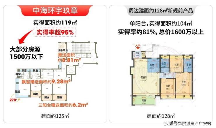 环宇玖章125户型实得率超95%,而宝华项目实得率仅约80%。按同等实用面积折算,环宇玖章实际单价就更划算,仅约10万/㎡。
