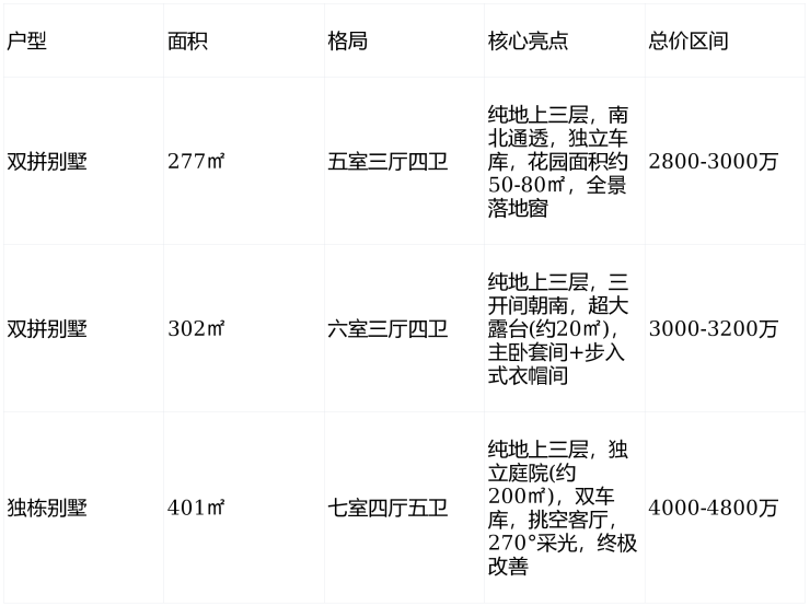 销售状态:项目已现房在售,目前剩余8套双拼别墅(277㎡/302㎡)和2套独栋别墅(401㎡),均价9.78万元/㎡,总价2800万起