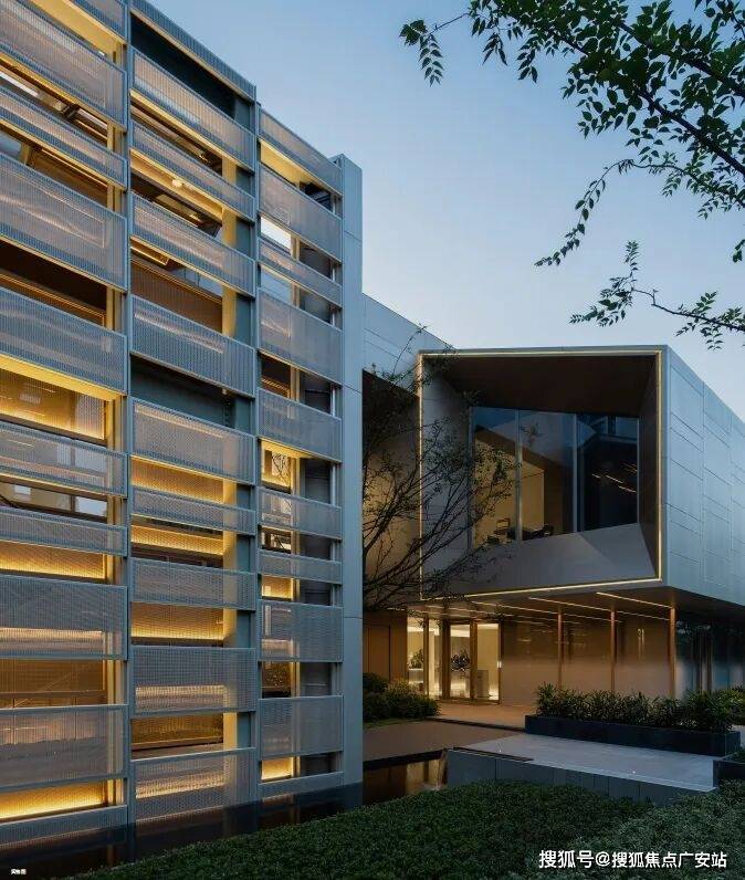 外立面为深灰色铝板、浅灰色铝板、浅灰色弹性涂料、玻璃栏板、中空玻璃、香槟色金色铝板,摩登、现代、平整,公建化很有辨识度。