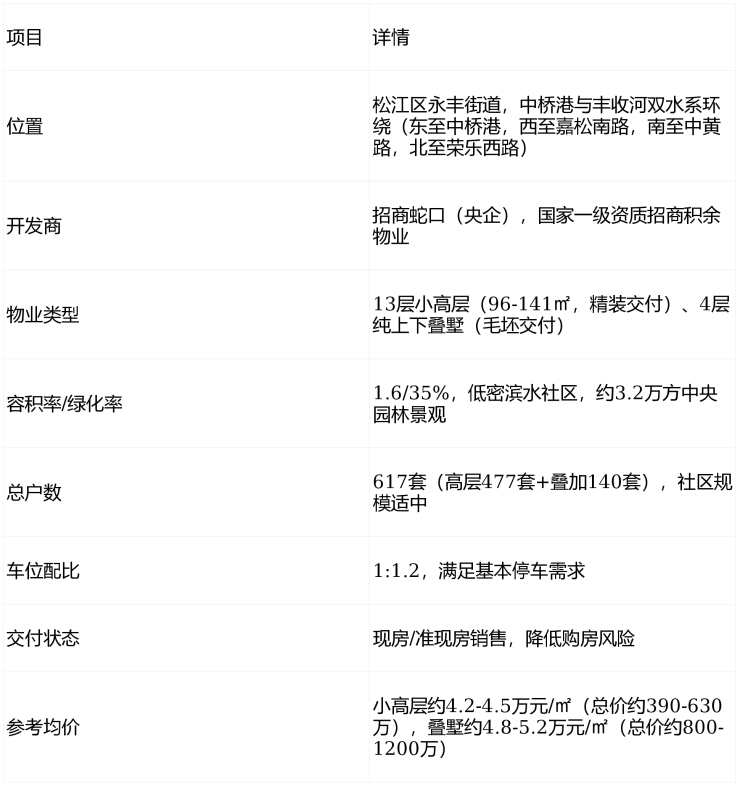 核心结论速览:这是松江新城中部核心区的低密滨水改善型项目,由央企招商蛇口打造,优势集中在低密滨水规划、央企品质、现房/准现房保障、户型多样性、商业配套成熟;短板主要是地铁通勤不便、部分楼栋受噪音与环境影响、叠墅户型设计有瑕疵、学区确定性存疑。适合预算中等、追求低密滨水生活、以自驾或有轨电车为主的刚需至改善家庭,尤其适合看重现房安全性的购房者。
