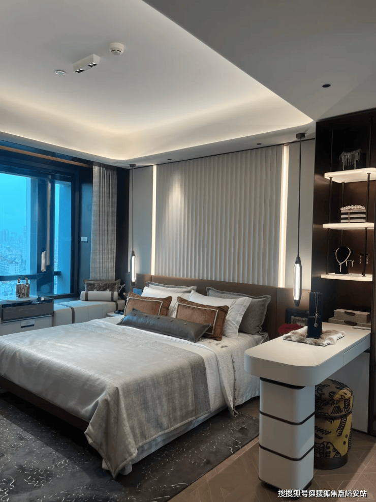 主卧套房配步入式衣帽间 + 270° 观景飘窗,北向次卧可变空间,适配多元需求。