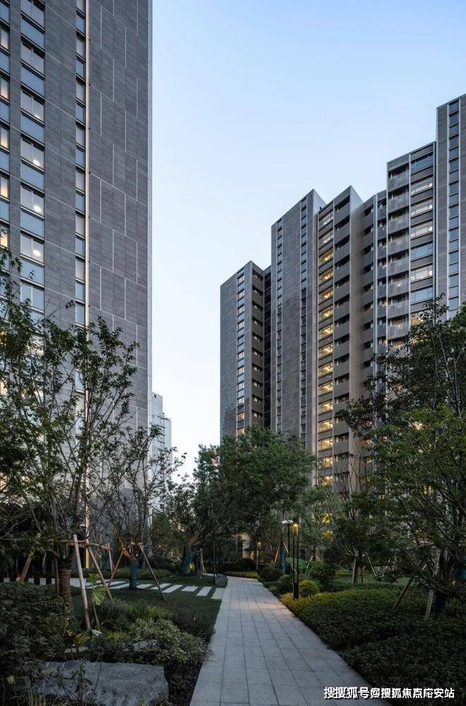 立面材料选取稍显沉稳的“皇室啡”花岗岩,其特殊的颜色与纹理,既能与北侧的办公统一色调风格,也能和周边现有的高容积率建筑,以及绿树成荫的街道环境融为一体,呈现低调精致、简洁大方的高品质住宅形象。