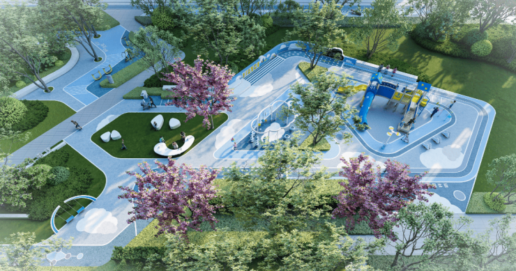 从小区东门进入,是一条以“静”为主的横向轴线,串联起了云享客厅、云上茶吧&轻云花园区、和风花园等空间,设置了康体设施、休憩坐凳、户外办公等设施和功能;从小区南门进入,则是条以“动”为主的纵向轴线,连通了亲子乐园、乐动广场区域,整个小区一楼全架空,打造各色主题的活动空间,全龄、全天候、全时段的多元场景,契合社区生活的互动、陪伴、共享的生活所需。