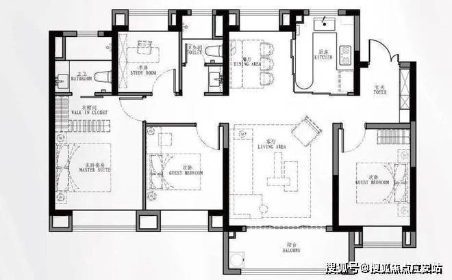 户型采用动静分离设计。三个卧室和一个书房都有大面积飘窗,空间感更强,利用率也更高。厨房操作空间大,次卫采用干湿分离设计,实用性更强。