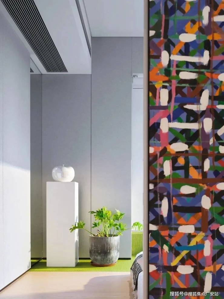动线中,移动门的后方是钢琴房。开合间,让音乐成为空间的总指挥,与艺术的装饰共生融合。