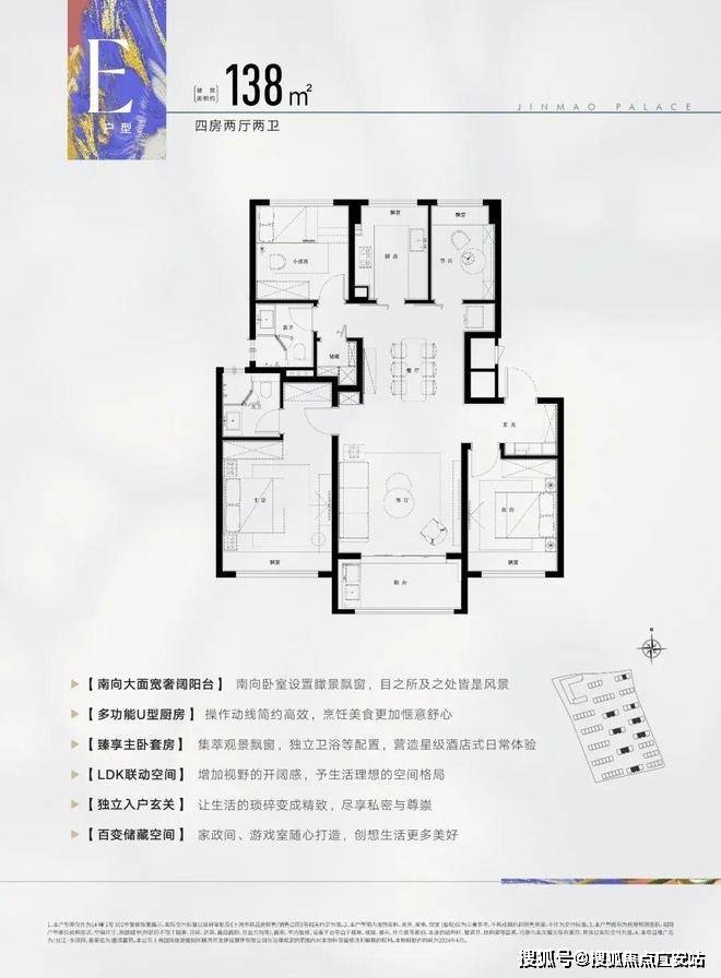 此户型为飞机户型,可以说是改善人群非常喜欢的户型,建面约138㎡4房2厅2卫设计,动静分区,三开间朝南,各空间尺度奢阔,还有一个大面宽景观阳台,实现功能性和舒适度兼得。