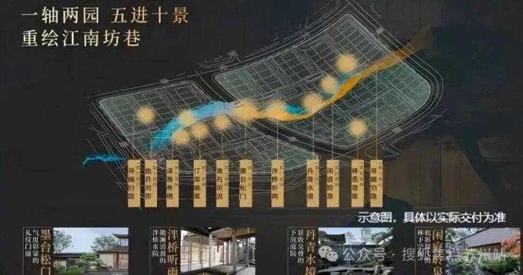 【园林】园林设计上依据“一轴两园 五进十景”规划,以豫园造景手法为基础,提取楼阁、折桥、墨池等中式元素,构建立体山水,重绘江南坊巷。