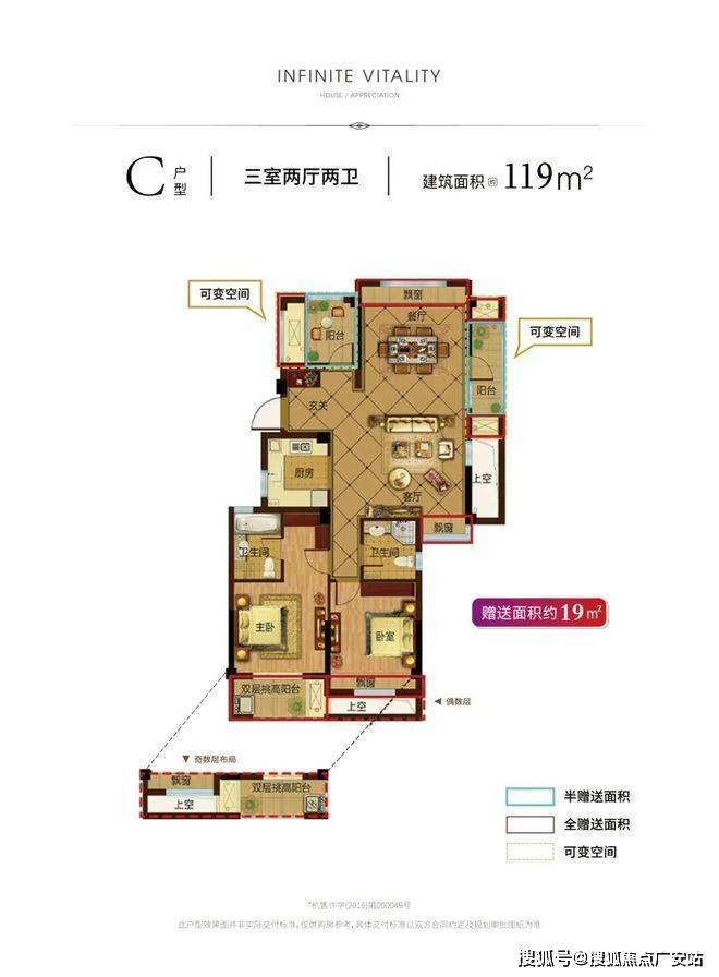 【119方】当然,也有供刚需购房者“一步到位”的三房户型——119㎡,其中可变空间也有约19㎡。