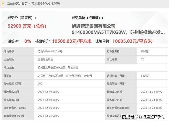 旭辉&城投&太平40号地块项目,即,苏地2024-WG-Z40号,位于相城区太平街道济学路西、陆巷浜南,是2024年12月25日,城投地产&旭辉&太平城乡一体化以底价52900万元竞得,成交楼面价10500元/平