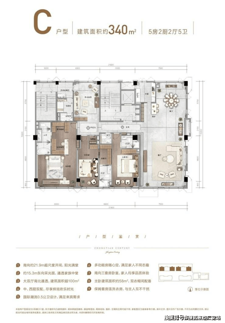 空间设计:主力户型315-340㎡精装大平层,一梯一户配置,全明设计、南北通透,部分户型赠送180°景观露台,得房率超90%