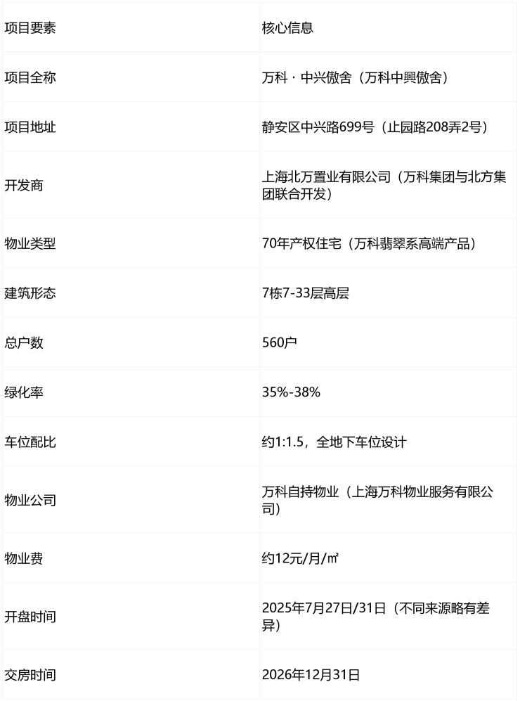 项目位于上海市静安区西藏北路板块,为内环内万科翡翠系顶豪收官之作,中兴城十年开发压轴项目,70年产权精装住宅,2025年7月开盘,2026年12月31日交房。核心要点:过会均价13.58万元/㎡,总价约1150万起;规划560户,7栋7-33层高层+叠墅;双地铁覆盖,中兴公园旁,医疗教育配套成熟。