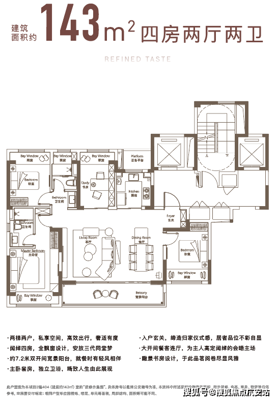 建面约143㎡户型,充分考量了一家三代的居住需求。阔绰的四房空间格局,可把南向卧室打造为老人房,北卧书房可改造成儿童活动空间,开放式的客餐连厅设计,可容纳一整个家庭的用餐。