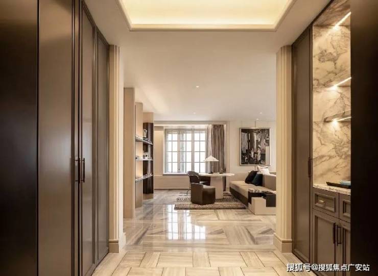 进入室内的入户玄关收纳空间,地面采用静雅棕、宝格丽兰石材拼花设计,古典回形波打+实心铜条的搭配增强入户尊贵感。右侧是山水白奢石的开放格,左侧是行李间,通过暗门的做法,将功能结合进去,强化了归家的仪式感。