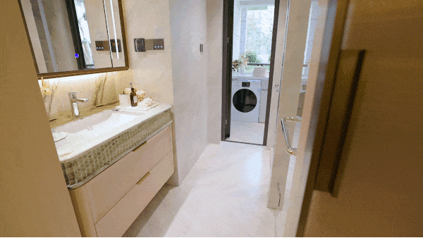 尤其是与卫生间相连的设备间,让浴室这个湿区被巧妙延伸,洗衣、家政动线就能与起居空间完全分离。幻想一下,洗完澡你再也不用抱着换洗衣服,横跨整个房间了。
