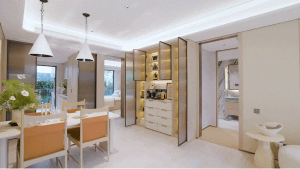 约10.6米南向面宽、可轻松容纳6人圆桌的餐厅、主卧配备270°转角窗,这套配置组合在以往的市场认知中,至少需150㎡以上大户型才能承载。这也体现了时代云境对新规的全新认知和创新,不仅是得房率的提升,更是舒适度的升维。