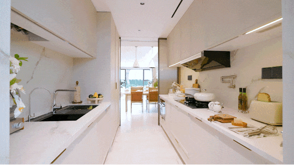 功能定制直击烹饪痛点,厨房选用方太高配款厨电,115㎡和129㎡标配蒸烤一体机,亮点在于同品牌下的功能自由选型——偏爱中式爆炒可选大吸力升降式油烟机,主打西厨可升级多功能灶具。