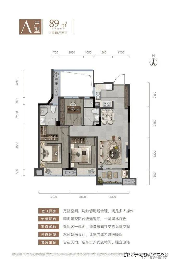 89㎡为稀缺小三房设计,双卫布局,实用性强