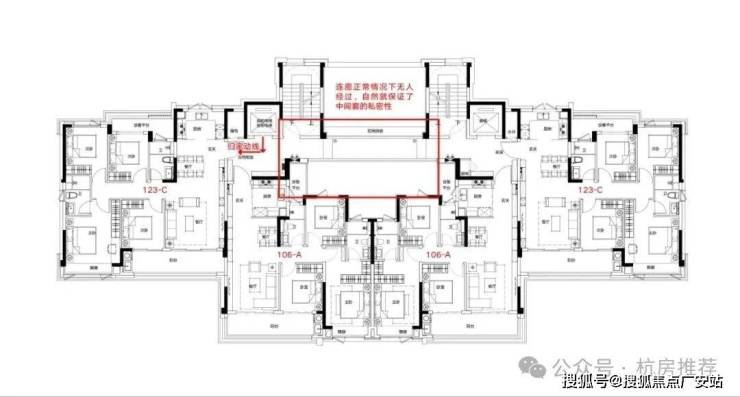 首先这个户型解决了中间套的隐私问题,如上图所示,两个边套回家都不需要经过连廊,所以保证了中间套的私密性。