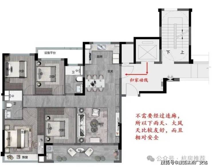 由于电梯的分开设置,连廊设置于中间,所以边套回家的时候不用经过连廊(见下图)。那么下雨天、大风天的时候就比较友好,也相对安全。