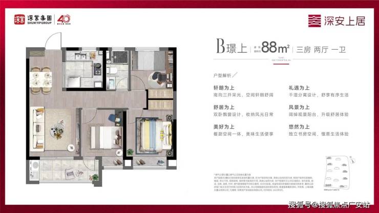 深业集团作为深圳“特区功勋企业”,以40年开发经验打造“上系”标杆。项目采用小高层设计(17-18层),容积率2.0,得房率82%远超竞品。88㎡户型三开间朝南,U型厨房预留双开门冰箱位;98㎡户型南北通透,主卧套房设计,适配家庭成长需求。精装标准含一线品牌家电,省去装修烦恼。
