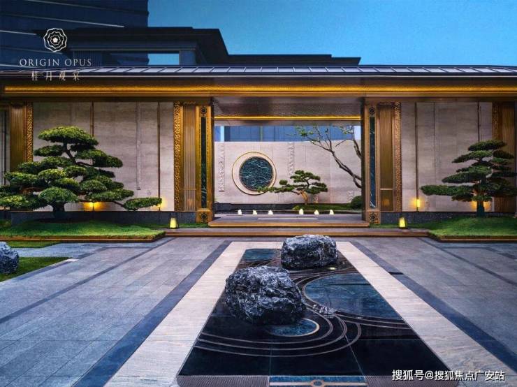 月影江南灵韵入境:入户两侧水景清泉涌动,婉转迂回,一座精致的宋风美学馆展示在眼前。透过门框衬映出满月景墙,甄选名贵奢石,在虚实掩映间延续着东方诗意山水的写意画卷。