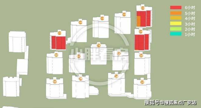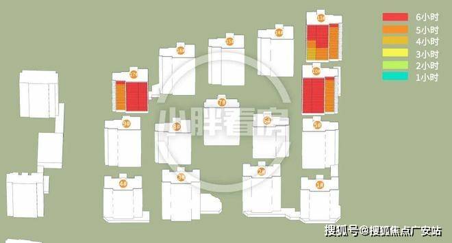 17号楼采光优异几乎不存在遮挡,10号楼低层受遮挡,13号楼中低层受遮挡。就具体遮挡时间而言,10号楼主要在傍晚受7号楼遮挡,13号楼主要在下午受14号楼遮挡。