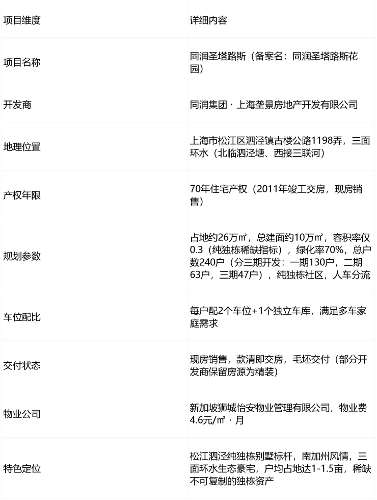 同润圣塔路斯的核心价值在于上海罕见0.3超低容积率纯独栋别墅+三面环水70%超高绿化率+南加州风情现房+8000㎡高端会所+佘山生态区+9号线地铁辐射+国际学校集群+户均1亩地+300-800㎡私家花园的顶级稀缺组合,既享受"纯独栋私密性+生态宜居"的居住体验,又拥有"地铁辐射+全维配套"的双重红利,同时现房保障让高端客群无后顾之忧。特别适合追求终极改善+生态宜居+圈层纯粹+现房保障的高端客群,是上海西南2000万级纯独栋别墅市场不可多得的"孤品标杆"。