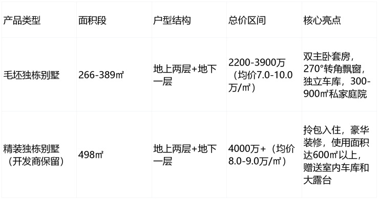 均价:毛坯独栋约7.0-10.0万/㎡,总价2200-3900万/套;精装独栋约8.0-9.0万/㎡,总价4000万+
