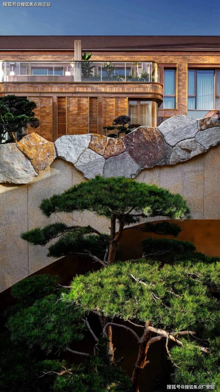 山水庭院汲取《足立美术馆》的造境手法,以老石皮、百年古木原样搬运,重现山间岁月的自然痕迹,与庭院中的光影交织,仿佛将山间的自然采光与静谧之感搬入城市。阳光透过树梢洒落,石皮上的纹理在光影中若隐若现,宛如一幅流动的自然山水画卷。