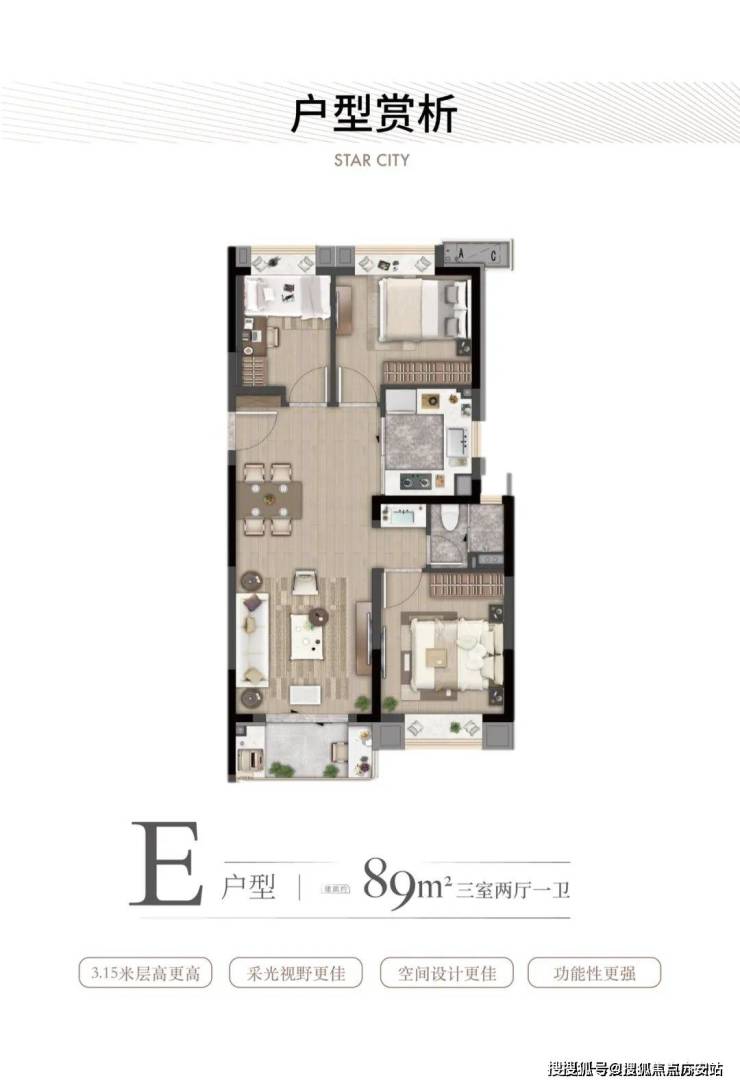 ·约89㎡户型:大虹桥范围不到90㎡的户型大部分都只做到2房,灿耀星城该面积段实现3房功能性,让自住客户一步到位,也让该产品进入二手市场后具备降维打击的优势!