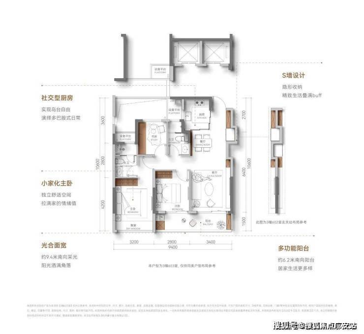 户型方正,没什么浪费面积,虽然是中间套设计,但做到了全明户型,通风效果好; 南向三开间,双联阳台+飘窗,南向采光充足,阳光满堂; 超配S墙,隐藏收纳柜,让小家越住越大,可以说杭州少见。