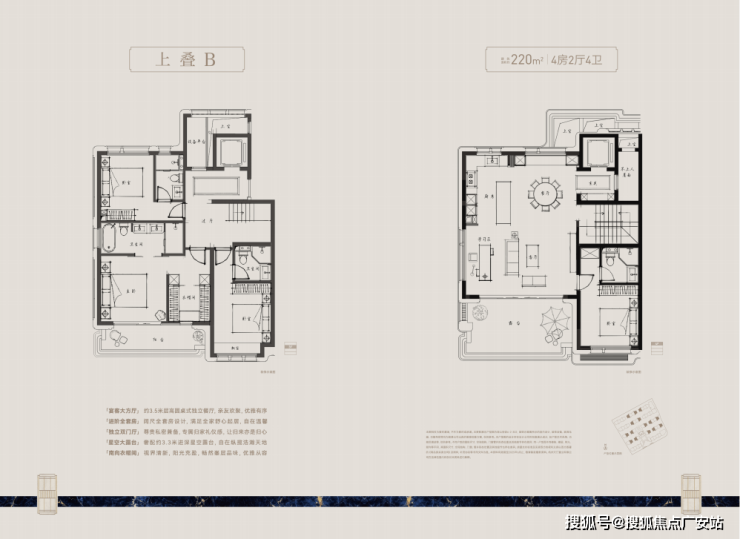 上叠约 220-280㎡:总价 1300-2400 万,星空双露台 + 地下室,顶层独立茶室,20㎡+ 南向大阳台