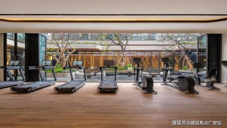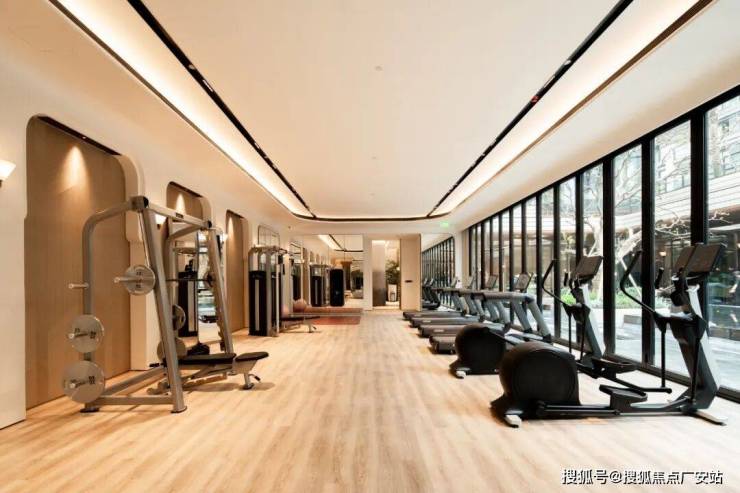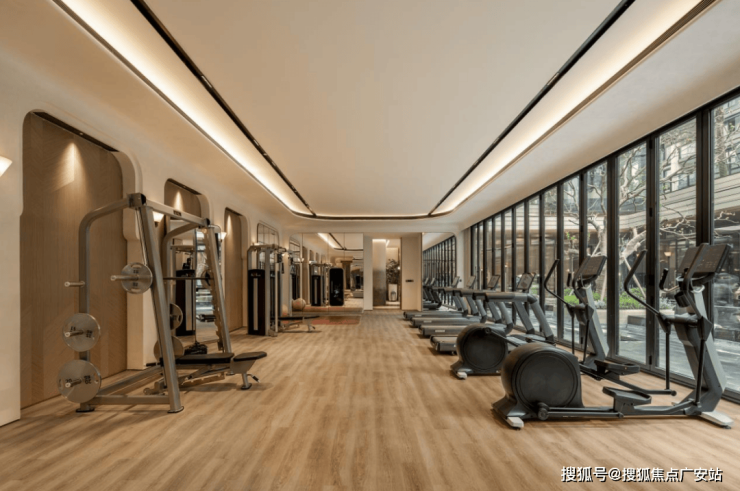 从室内恒温泳池出来,是仍然朝向下沉式庭院的瑜伽室,再往前走是健身房,它配备了小飞鸟训练器、卧式健身车、跑步机、椭圆机、哑铃训练椅等等各种健身器材。