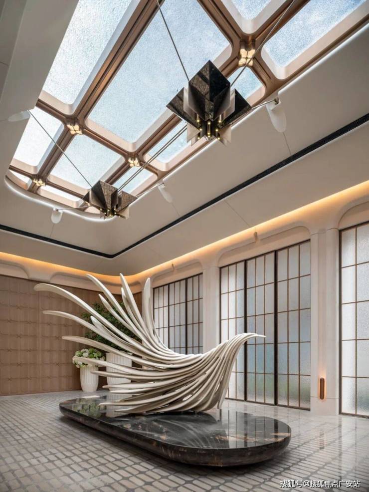 走进大门,进入大堂序厅,迎面而来的是一座名为「鲲鹏破空」的雕塑作品——在素雅的窗格门中,更加透射着「扶摇而上」的气势。