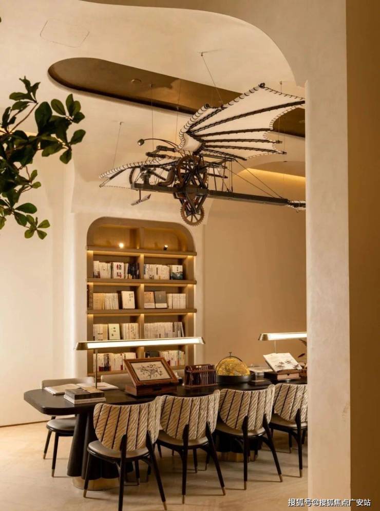 再往前走,穿过一道走廊上的门仪,你眼前是达·芬奇式的阅读室,长桌上方悬挂的,是根据达·芬奇飞行器手稿创造的「木鸢溯风」。阅读室里藏着很有包裹感的自习室,他们还额外配置了弥散式增氧设施。