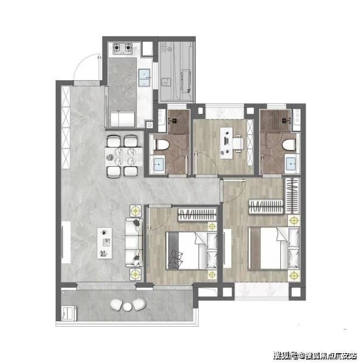 该户型做到了三开间朝南+超大面宽横厅+主卧套房设计+卫生间干湿分离+南北通透,功能性和尺度感完美结合。