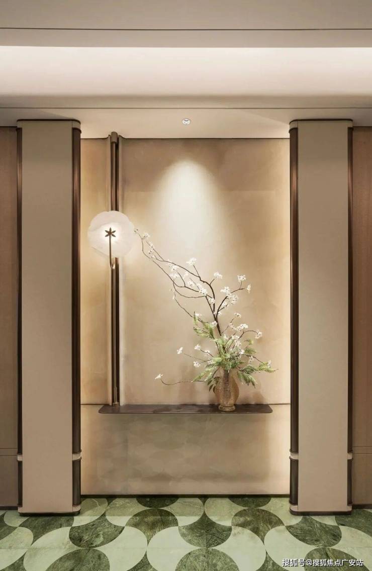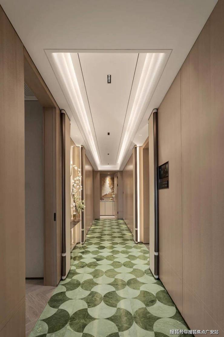 主卧的锤纹门把手、地板花瓣拼、镂花的空调出风口每一个都是世界级的工艺。同样,精装的用材也很考究,从电梯厅到室内各种奢材在这里齐聚,瑞士翡翠、白雪公主、蒂芙尼绿、巴黎金等奢石,还有仿锤纹夹丝玻璃、仿古锈镜、隐木这些罕见用材增添艺术质感。