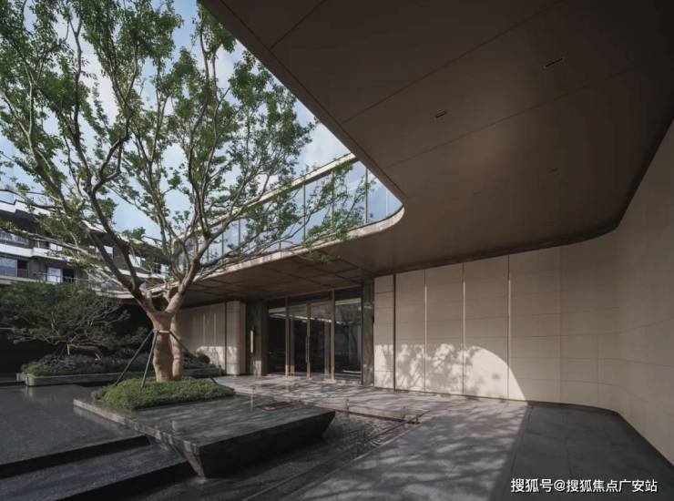 社区入口设计以“隐奢”为核心理念,摒弃传统豪宅项目的张扬符号,转而通过材质、比例与空间叙事的精准把控,传递低调中的精致感。主入口并未采用高耸的门楼或繁复的装饰,而是以米黄色石材与香槟金色金属格栅的组合,构建出克制而优雅的视觉语言。