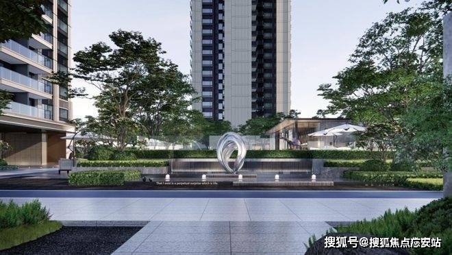 对景水景位于社区入口空间,现代轻盈的景观雕塑坐落于精致水景之上,金属质感波光粼粼水面遥相呼应,彰显着品质感。
