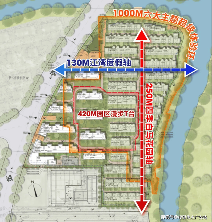 约130米的横向度假轴与约250米的纵向四季花园轴交织,串联起中央水景、阳光草坪、亲子游乐区等,与外部湿地公园呼应,形成“社区园林+外部生态”的双重景观体系,旨在实现四季有景、移步换景的梦幻居住体验。